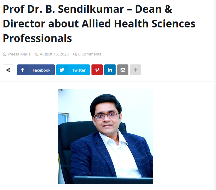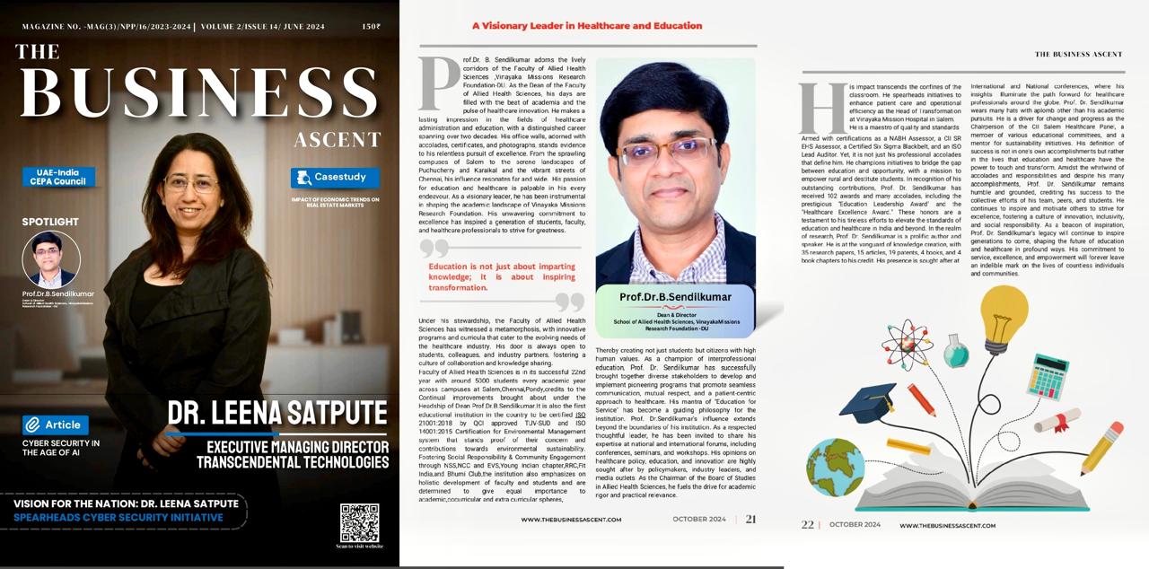 Dean Prof.Dr.B.Sendilkumar has been featured in the "Spotlight of The Business Ascent Magazine" . This honour has been endowed for his contributions towards Healthcare education.