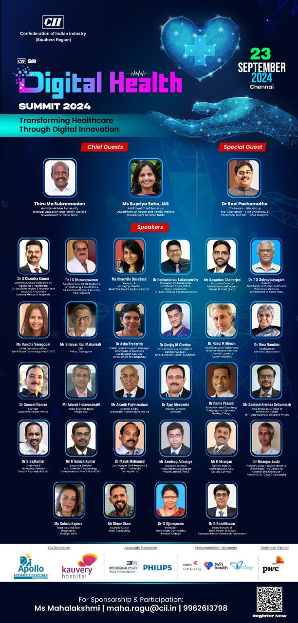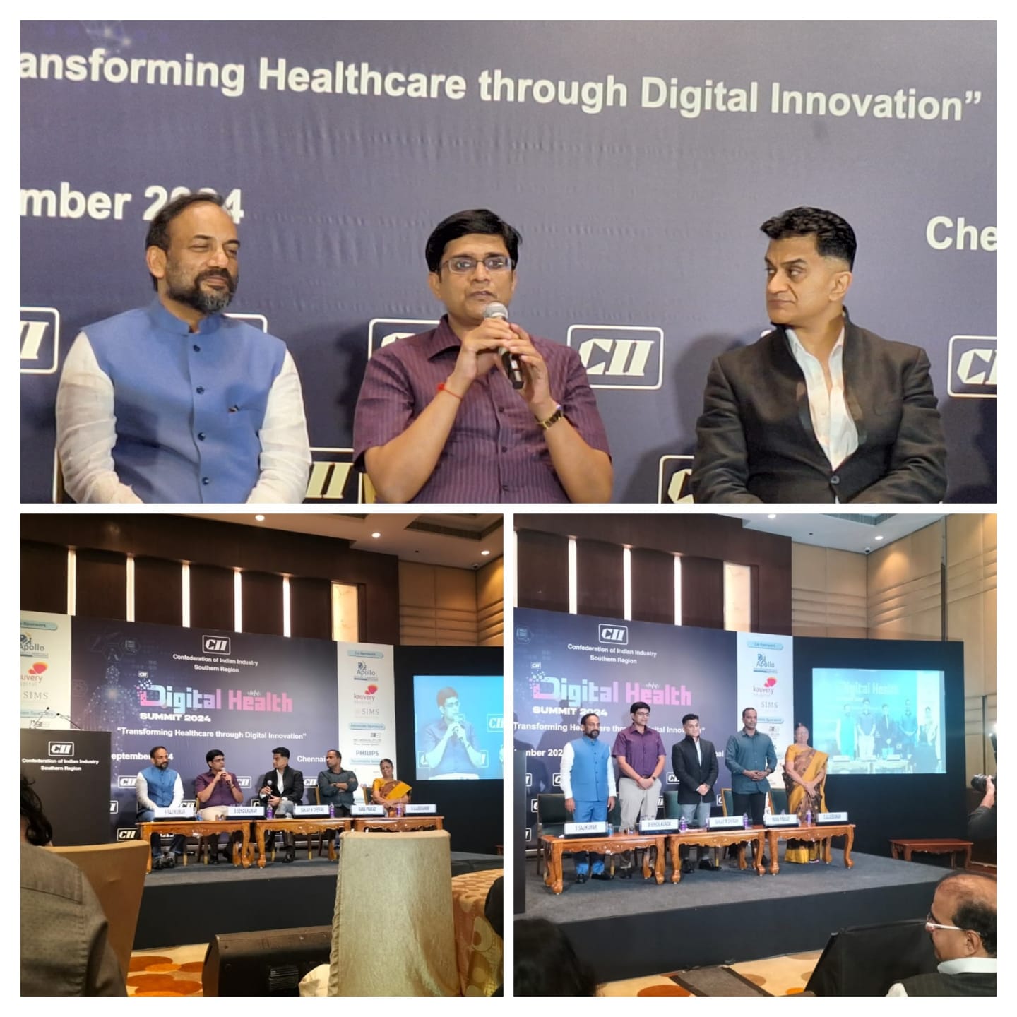 Digital Health Summit 2024 was organised by Confederation of Indian Industries (CII) at Chennai.Proud and honoured to have participated as a Guest speaker in the event which hosted Honourable Ma.Subramaniam,Minister for Medical and Family Welfare, Government of TamilNadu,Ms.Supriya Sahu,IAS-Additional Chief Secretary Health Dept Govt of Tamil Nadu as the Chief Guests and the Special Guest Dr.Ravi Pachamuthu,Chairman Of SRM Groups, Chancellor Of SRM Haryana University, Managing Director Of SIMS Hospital. It was a great opportunity to share my insights,address the questions and concerns about "Transforming Healthcare through Digital Innovation" with more than 100 enthusiastic attendees.