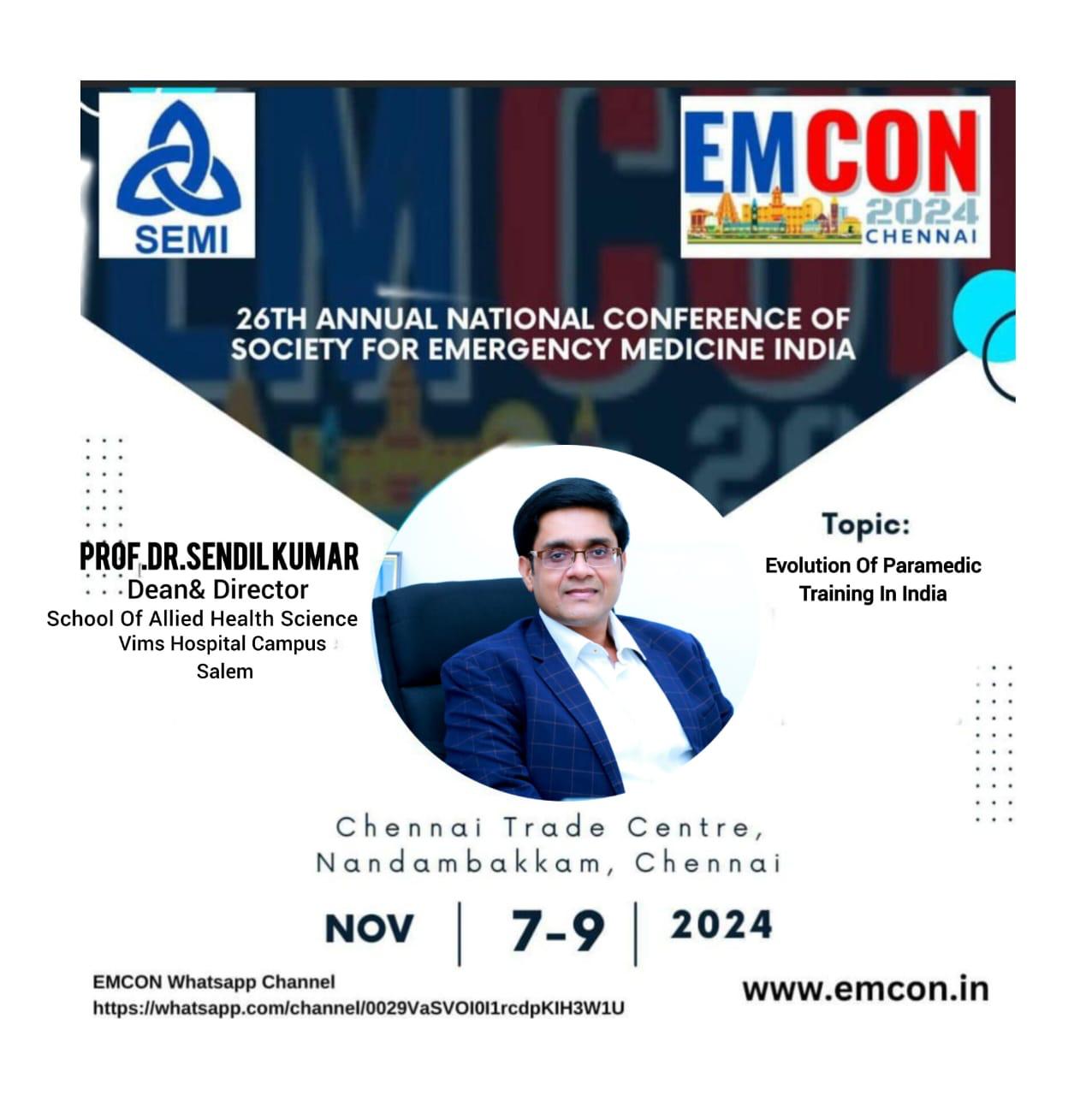Prof.Dr.B.Sendilkumar,Dean-AHS, VMRF-DU had been invited as a Guest speaker at EMCON 2024 to present on the topic "RISE OF PARAMEDICS".EMCON 2024 ,a premier International conference for emergency medicine professionals was conducted by the Society for Emergency Medicine India – SEMI in Chennai.The conference had around 2500 participants from the stream of Emergency Medicine across the Globe.It was a great honour as Sir presented a talk representing School of Allied Health Sciences VMRF-DU amongst the renowned International subject experts. We were also awarded as "The most prestigious institution for Emergency Medicine Technicians" in India during the conference.