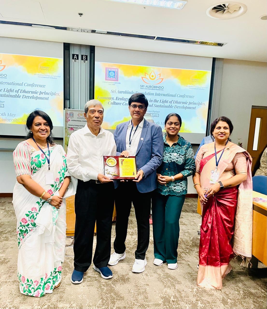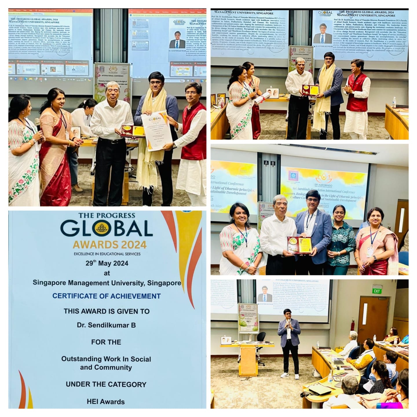 Prof.Dr.B.Sendilkumar,Dean-AHS had taken part and presented a paper in the International Conference on Economy,Ecology and Equity in the Light of Dharmic principles ,Culture Conservation and Sustainable Development organized by Sri Aurobindo Foundation held at Singapore Management University,Singapore. Proud to add that He has been awarded for the "Outstanding Work in Social and Community" under the HEI category by the Progress Global Awards 2024.He received the award from Dr.Habibullah Khan,Former Associate Professor of Economics, National University of Singapore,Professor of Business,Manipal GlobalNxt University,Malaysia,Dr.S.M.Ghosh,Managing Director, The Progress and Prof.Tom Smahon,Director,Mega Forte Pte.Ltd.Singapore.