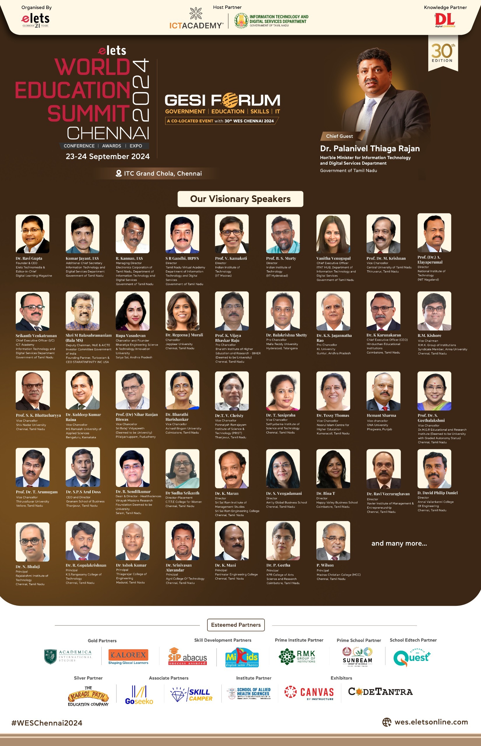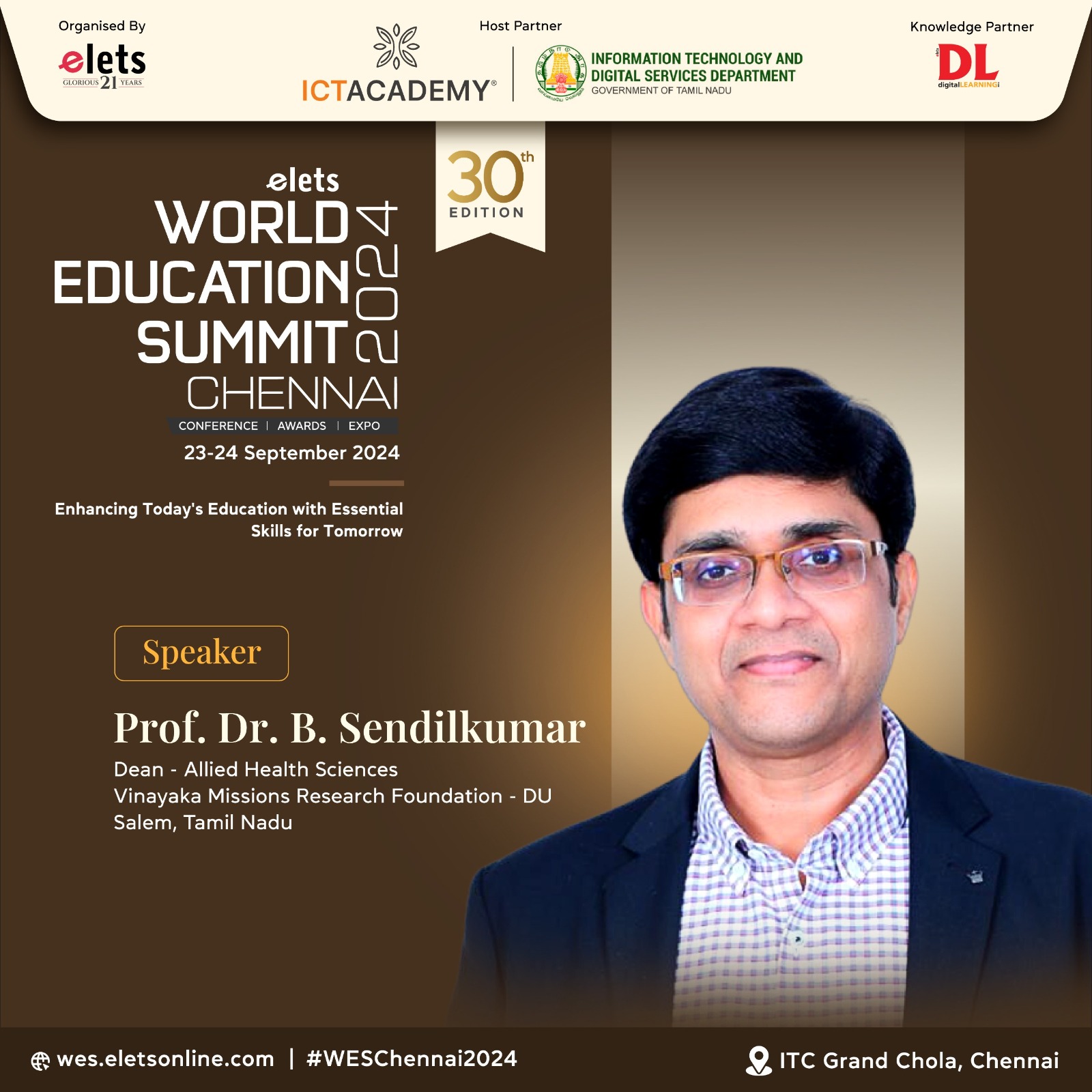 Prof.Dr.B.Sendilkumar,Dean,AHS, VMRF-DU had been invited as a Guest speaker at the World Education Summit 2024 organised by Elets in collaboration with Information Technology and Digital Services Department,Govt.of Tamilnadu and ICT academy in Chennai He was applauded for sharing his invaluable insights and experiences in the topic of Transformational Leadership that emphasized on the importance of Inclusivity and Diversity into Health sciences programs,Change Management in Health education for Sustainability. He shared the stage with eminent personalities from Academics,Industry including Governmental and Non governmental sectors and renowned Researchers.